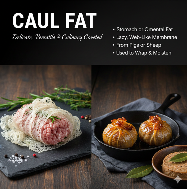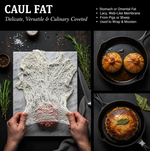 Definition: The stomach or omental fat. It is a delicate, lacy membrane of fat surrounding the stomach and other internal organs, primarily from pigs or sheep. Relevance to Butchery: Caul fat is highly prized for culinary uses. It is often used to wrap lean cuts of meat or ground mixtures (like pâté, faggots, or sausages) to keep them moist during cooking, melt away easily, and add flavor.