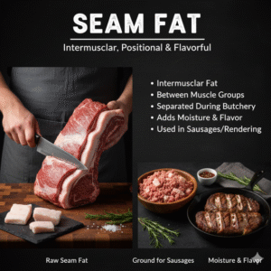 Definition: Intermuscular fat—the visible fat deposits found between individual muscles or muscle groups. Relevance to Butchery: Seam fat is generally separated during the deboning and portioning process, defining the boundaries between different cuts (sub-primals). While usually trimmed away from retail cuts, it can be utilized in sausage making or rendered for other culinary fats.