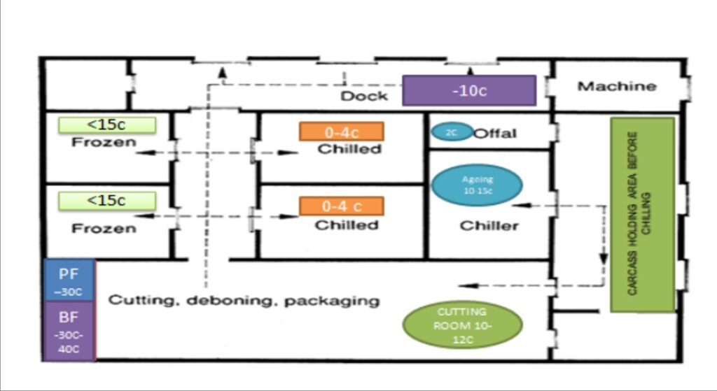 The section includes mainly the cold storage section (ageing/setting room) and cold deboning section then frozen storage.