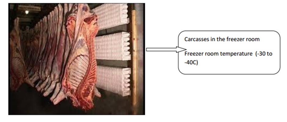 Ones the carcasses (after deskining /dehiding, the internal organs like stomach , intestine,etc are removed, the removing skeleton with the bone is called carcasses), these carcasses are held or kept in the chiller room (temp 10-15C) for ageing or ripening , then it is taken for cold deboning then packed and then kept for freezing (-30 to -40 c) then kept in frozen storage (18).