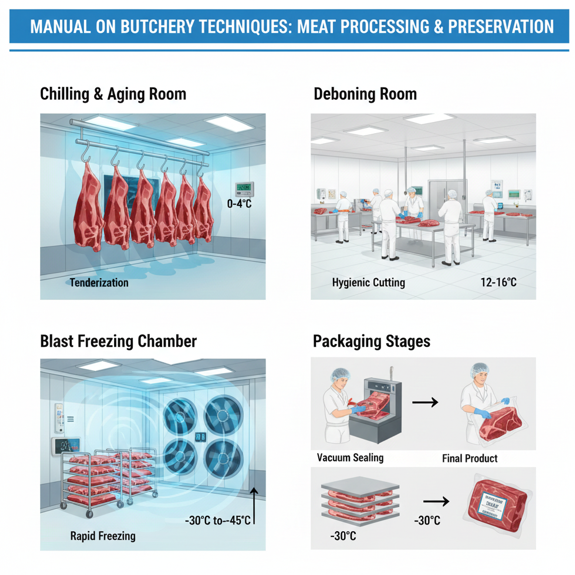 - Quick and blast freezing: methods for preserving meat texture and flavour (−30°C to −45°C).